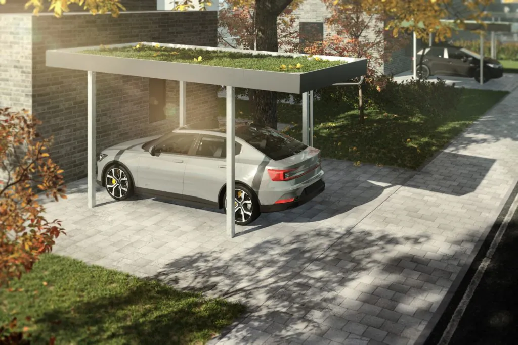 Our table carport can help to improve your ecological footprint. For example, through photovoltaic modules on the roof surface. Or through the optionally available green roof, which not only enables smooth transitions to the surrounding landscape, but also helps to improve the microclimate by storing rainwater.