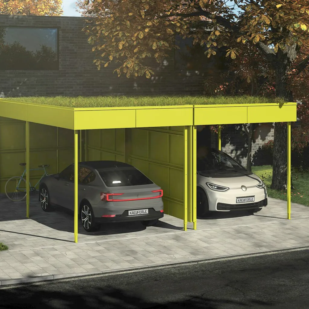 The steel skeleton construction made of hot-dip galvanised or powder-coated hollow steel profiles is available in numerous standard and special RAL colours - as is the all-round roof edging made of smooth aluminium sheet. Instead of the robust trapezoidal sheet metal roof covering, the table carport is also available with a green roof.