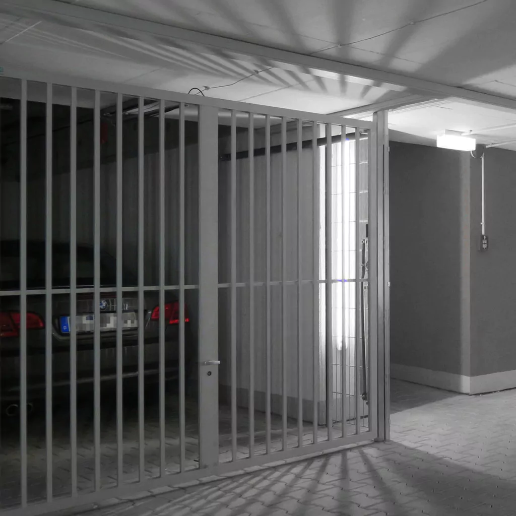 Our double-leaf garage doors for parking bays in collective garages offer an uncomplicated and simple way to securely close off parking spaces. The robust, low-wear door leaves are made of lightweight aluminium and do not require any complex technical details.